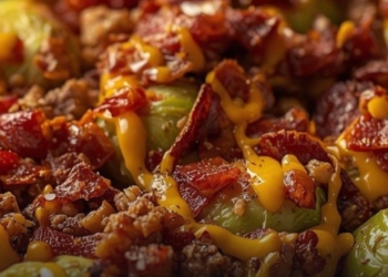 Deze ovenschotel met spruitjes:, gehakt, spek en honing-mosterdsaus is puur genieten