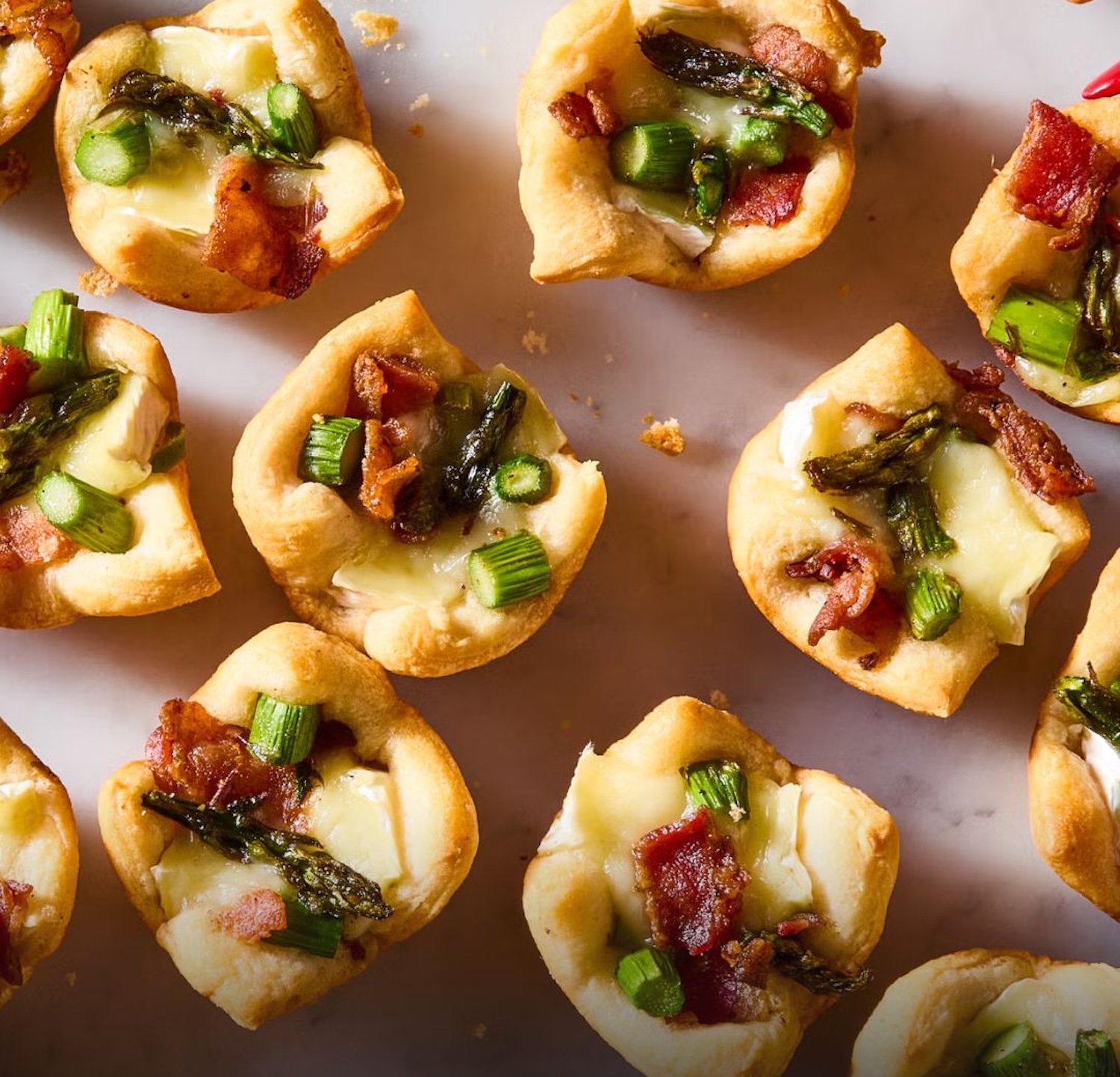 Soms wil je op tafel zetten dat er feestelijk uitziet, maar waar je niet een halve middag voor in de keuken hoeft te staan. Deze kleine hapjes met brie, bacon en asperges vallen precies in die categorie: knapperig, romig en net een tikje lente-achtig.