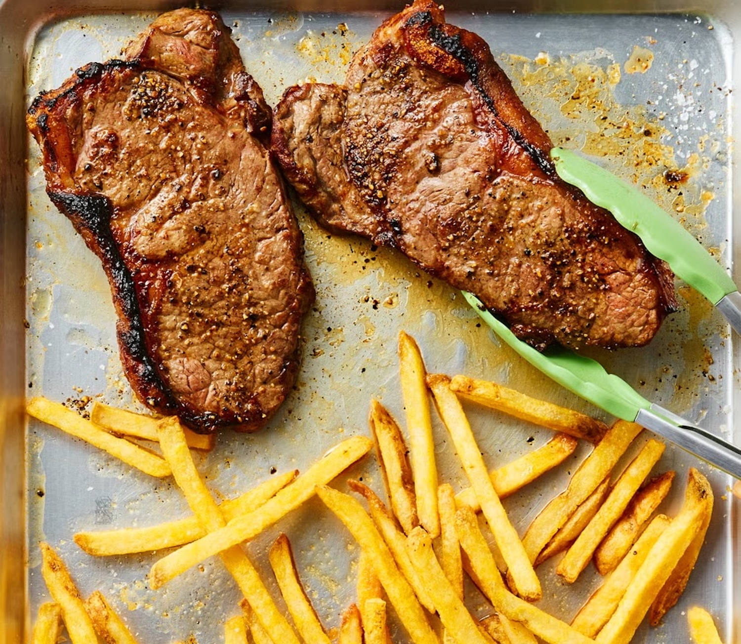 Veel mensen bakken steak in een pan, maar op een bakplaat kan het ook verrassend goed—mits je timing klopt. Laat de friet eerst bijna gaar en knapperig worden voordat je ruimte maakt voor het vlees.