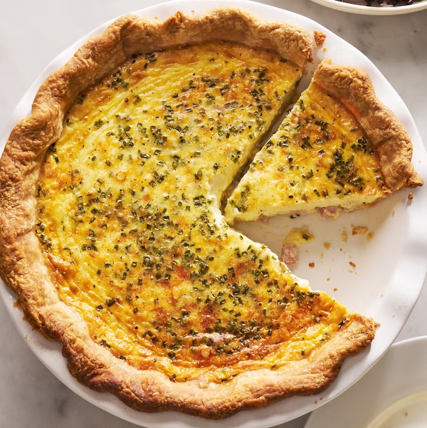 De magie zit ’m in de combinatie: een knapperige, boterige bodem en een zachte, romige vulling die nét stevig genoeg is om mooi te snijden. Met ham, bieslook en Gruyère krijg je bovendien die klassieke smaak die bijna altijd in de smaak valt.