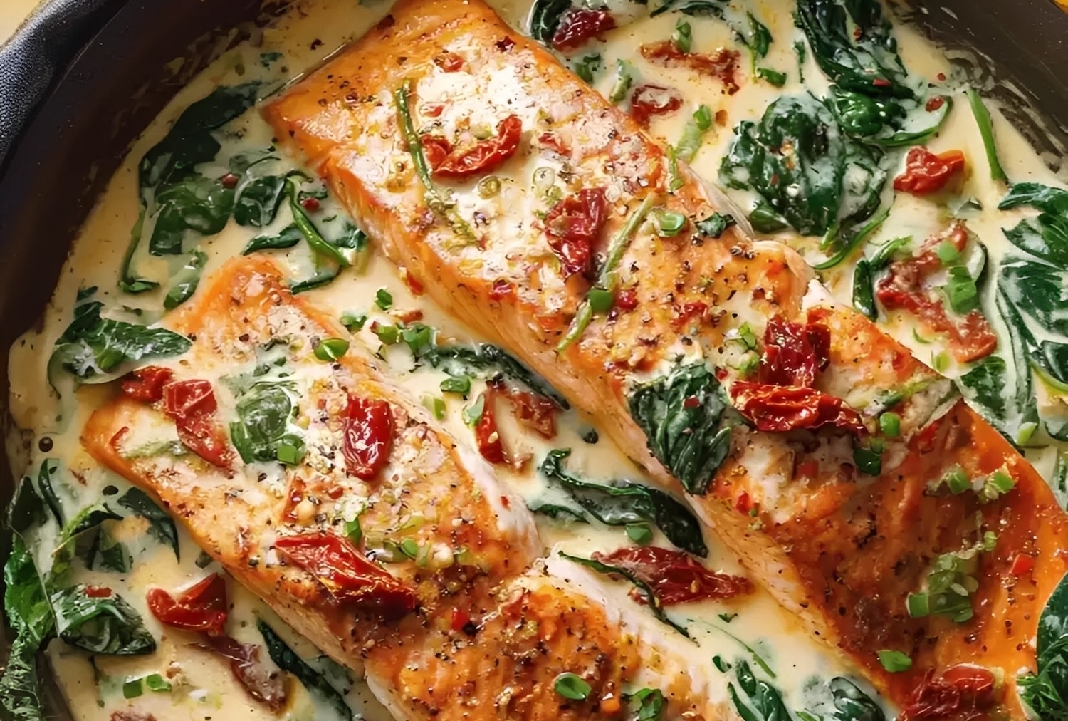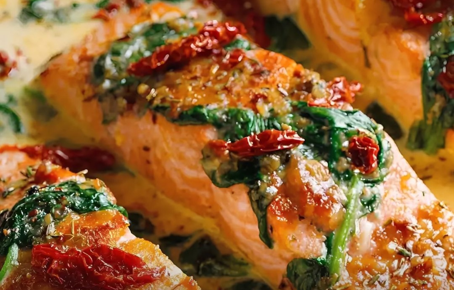 Je hebt zalmfilets nodig (met of zonder vel), zongedroogde tomaten, room, knoflook, verse spinazie, parmezaan, kippenbouillon, Italiaanse kruiden, boter, olijfolie, zout en zwarte peper.