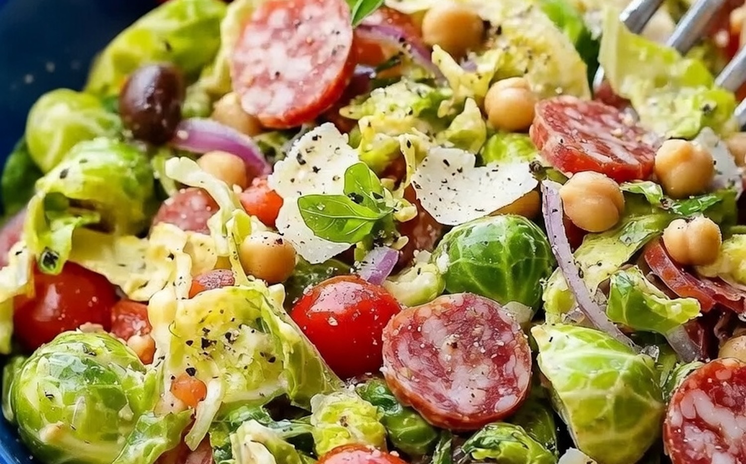 De truc zit ’m in een combinatie waar je misschien niet meteen aan denkt: rauwe, flinterdun gesneden spruitjes met salami, kaas en tomaat. Alles krijgt karakter door een stevige dressing met rode wijnazijn, knoflook en Italiaanse kruiden.