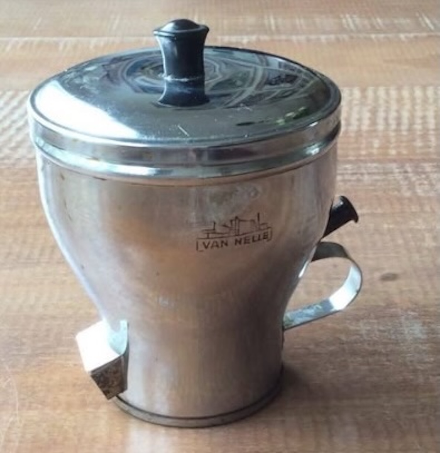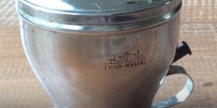 Op het eerste gezicht lijkt het niet meer dan een compact metalen potje: zwaar in de hand, glanzend aan de buitenkant en voorzien van een deksel dat stevig dichtvalt. Toch is dit zo’n voorwerp dat meteen een tijdsbeeld oproept zodra je weet wat het is: een Van Nelle-suikerpot, bedoeld om dag in dag uit op tafel te staan.